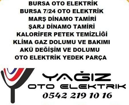 Bursa Oto Elektrik, Şarj Dinamo Tamiri, Marş Dinamo Tamiri, Akü Takviye ve Tamiri, Uzaktan Kumanda ve Merkezi Kilit Sistemi, Oto Alarm Park Sensörü, Cam Kriko Tamiri, Oto Klima Bakım Onarım, Oto Elektrik Yedek Parça, Kalorifer Petek Temizliği Hizmetleri Vermekteyiz.